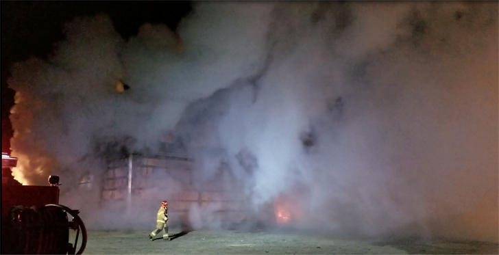 Firefighters arriving on scene encountered several small explosions from inside the structure, which Langley says were likely the result of several tires being burned and the presence of some propane bottles. A portable tank was set up at the fire scene, and Langley says it took a lot of water trying to knock down the flames.