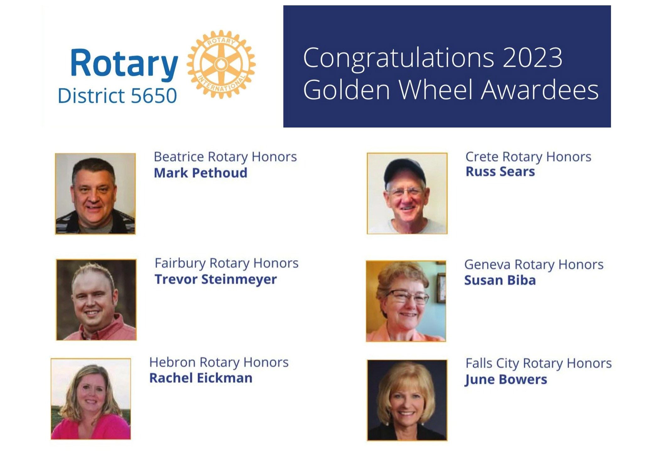 LINCOLN - Six local volunteers were named as Golden Wheel Award winners at the District 5650 Rotary Conference on Saturday, April 1, in Lincoln.